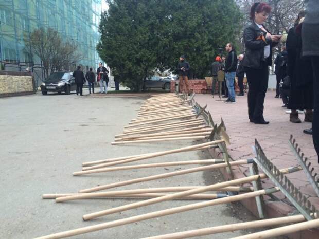 В Сети опубликовали фотографии встречи оппозиционера Михаила Касьянова жителями Тольятти. Как сообщают местные СМИ, активисты поджидали политика с граблями. Садовый инвентарь принесли и разложили у входа в гостиницу "Парк отель", куда должен был прийти бывший российский премьер.